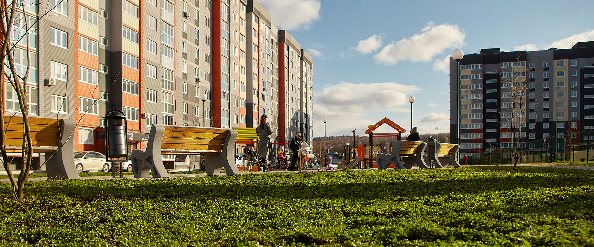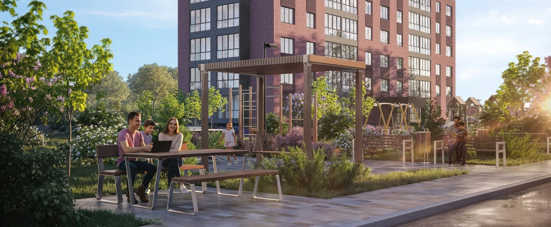 Многоуровневое озеленение превращает территорию комплекса в спокойное и уютное пространство. Высаженные деревья защищают от палящего солнца, а вечерняя подсветка добавляет тепла и уюта.